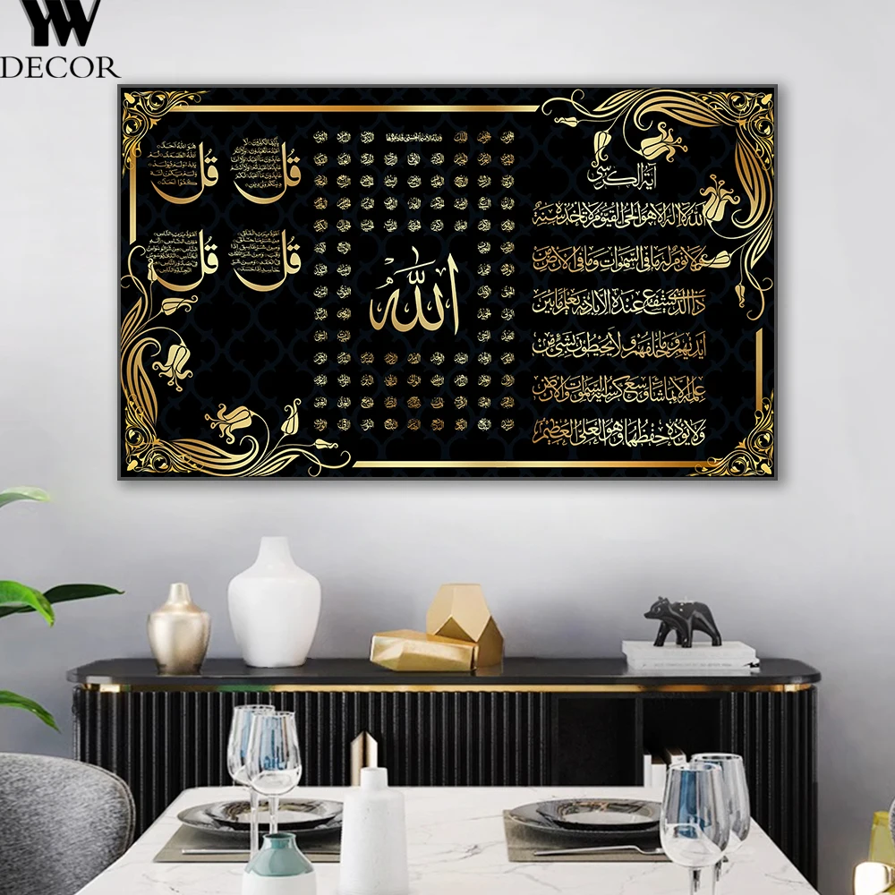 طباعة قماش الخط العربي الأسود والذهبي ، صورة إسلامية ، فن جداري ، رسم ، ديكور منزلي ، ملصق لغرفة المعيشة